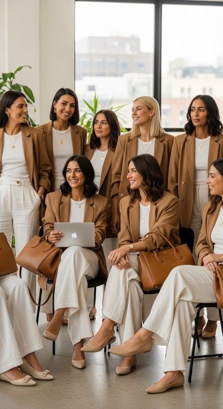 A slouchy camel colored oversized blazer with slightly dropped shoulders creates sophisticated structure while maintaining relaxed proportions for warm weather professionalism. Layer over a simple white tank with high-waisted cream linen wide-leg pants that flow beautifully with every step. Nude pointed-toe flats with a low kitten heel add refined polish without sacrificing all-day comfort. A tan leather structured tote bag provides professional organization and complements the camel blazer perfectly. Minimalist gold jewelry including a delicate watch and simple rings keeps the look polished and intentional. This look demonstrates that oversized tailoring can be incredibly chic for creative industries or business casual environments.