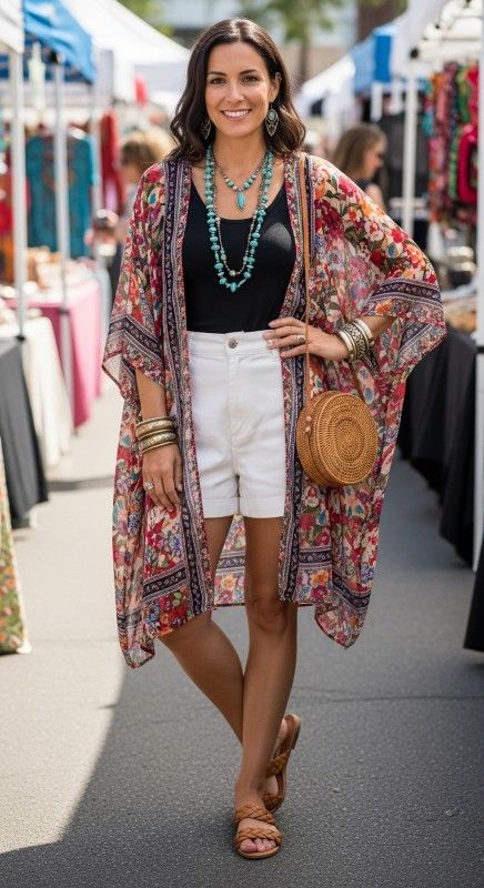 An oversized floral print kimono in lightweight chiffon drapes beautifully over a simple black tank and high-waisted white shorts for bohemian summer elegance. The flowing sleeves and relaxed silhouette provide coverage while maintaining breathability in warm temperatures. Tan leather flat sandals with braided details add earthy texture and comfortable support for all-day wear. A woven rattan crossbody bag with leather strap brings natural texture and hands-free convenience to the ensemble. Layered turquoise and silver necklaces and stacked bangle bracelets enhance the free-spirited bohemian aesthetic. Perfect for outdoor markets, beach cover-ups, or adding artistic flair to simple summer basics.