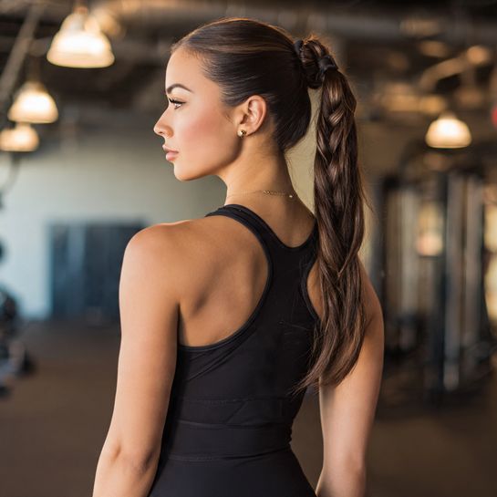 Polished athletic elegance. High ponytail with braid wrapped around base creates refined sporty look.
