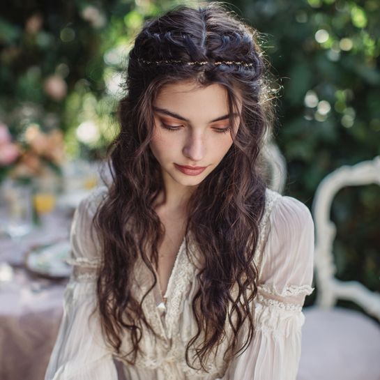 Cascading romantic detail. Braid incorporating falling strands creates delicate crown effect.
