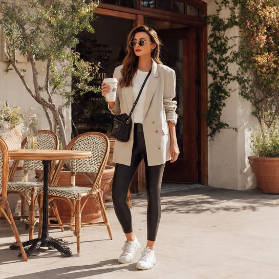 Polished casual sophistication. Structured blazer over fitted leggings creates balanced modern proportions.