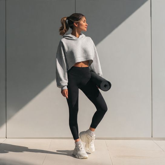 Athleisure proportion play. Short hoodie with high-rise leggings creates trendy sporty silhouette.