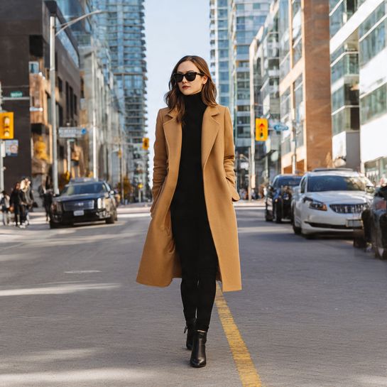 Dramatic outerwear impact. Floor-length coat over leggings creates sophisticated urban style.
