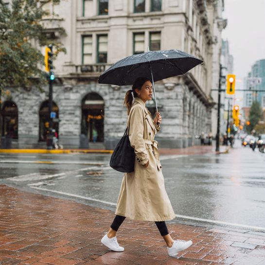 Classic outerwear sophistication. Traditional trench over leggings creates polished spring transitional look.