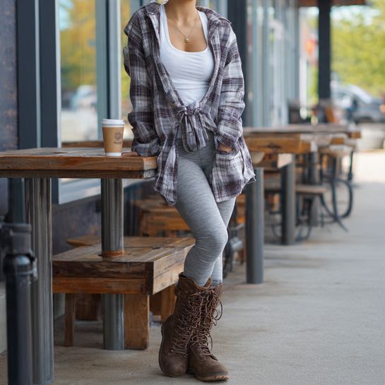 Casual comfort classic. Oversized flannel over leggings creates relaxed weekend aesthetic.