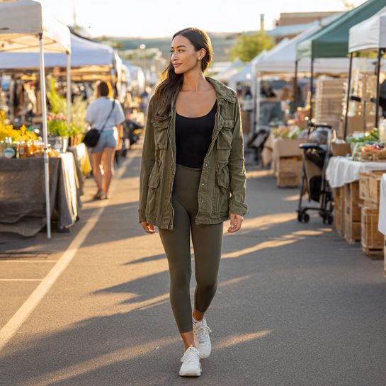 Functional casual style. Cargo-style jacket over leggings creates practical modern aesthetic.