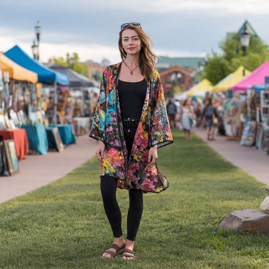 Flowing layered bohemian. Long kimono jacket over leggings creates relaxed artistic aesthetic.