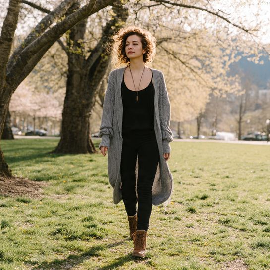 Cozy layered elegance. Floor-length cardigan over leggings with ankle boots creates comfortable sophisticated look.
