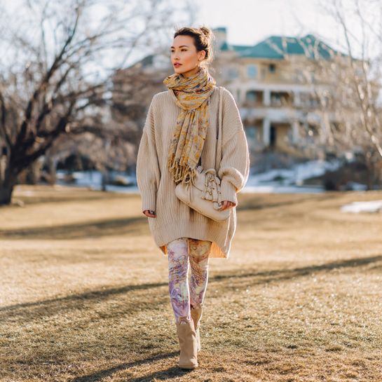 Pattern with cozy balance. Chunky neutral sweater with patterned leggings creates visual interest.