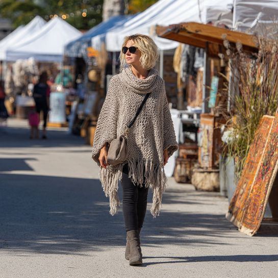 Bohemian layered comfort. Oversized poncho over leggings creates relaxed artistic spring aesthetic.