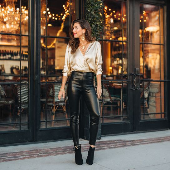 3. Leather Leggings with Silk Blouse