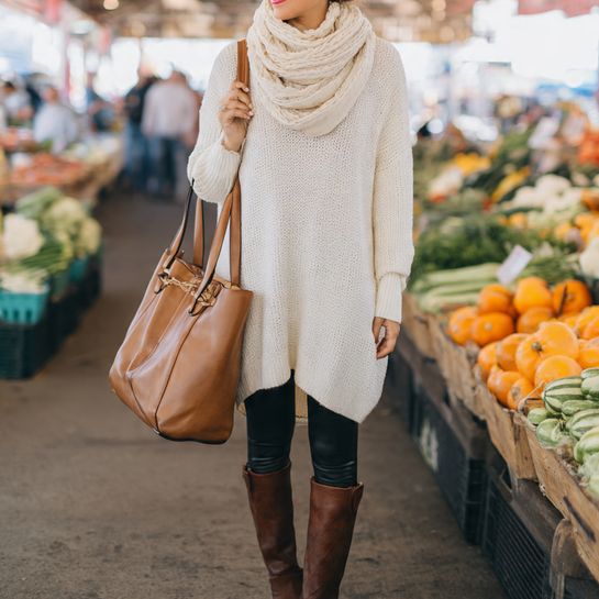Proportional cozy comfort. Oversized tunic-length sweater with fitted leggings creates balanced casual look.