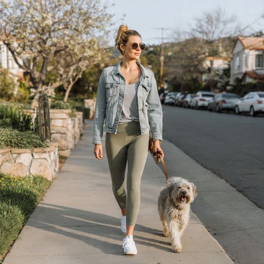 Polished casual color. Structured jacket over tee with colored leggings creates modern spring statement.