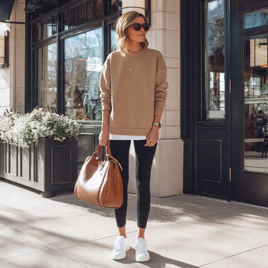 Refined athleisure. Quality sweatshirt with leggings styled with elevated accessories creates polished casual.