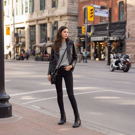 Edgy casual cool. Moto jacket over leggings outfit creates contemporary street style aesthetic.