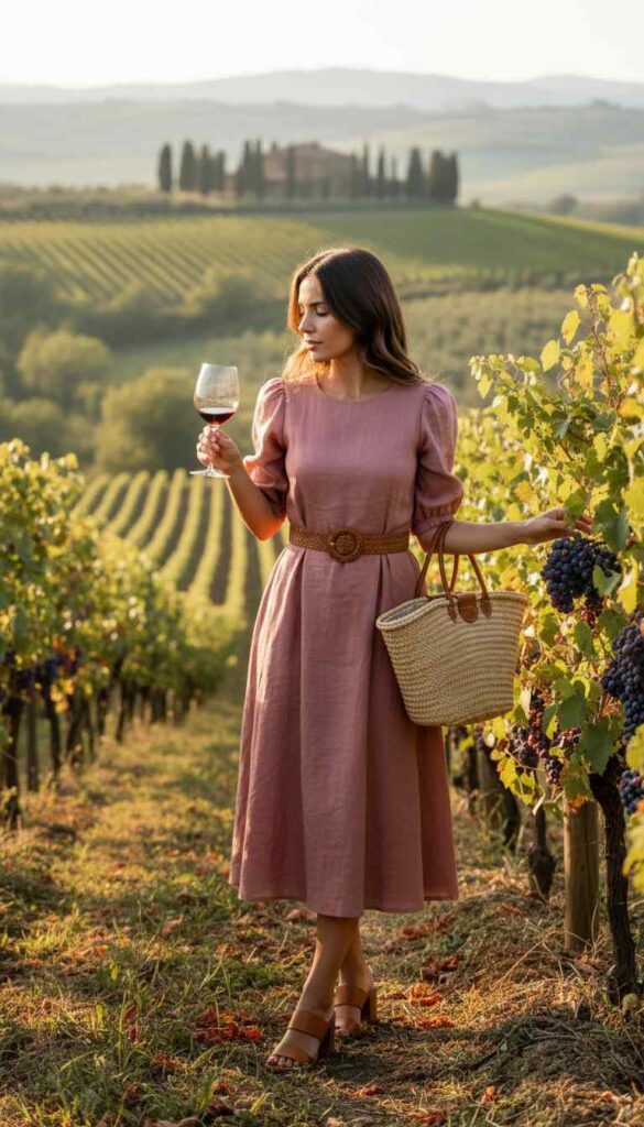 Romantic sophistication for wine country exploring and vineyard tasting experiences.