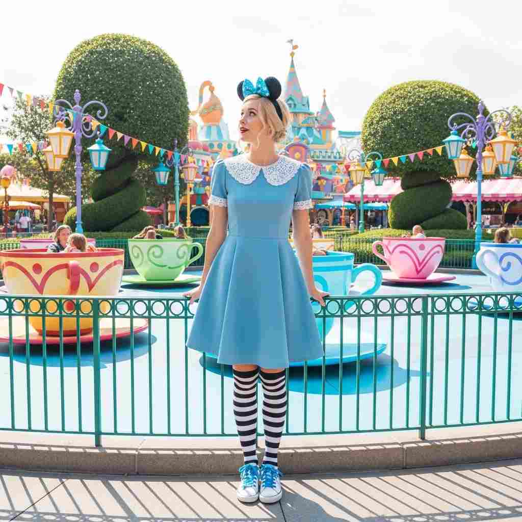 Light blue dress with white details and black headband creates a subtle Alice tribute. Comfortable enough for exploring but photo-ready at every turn.