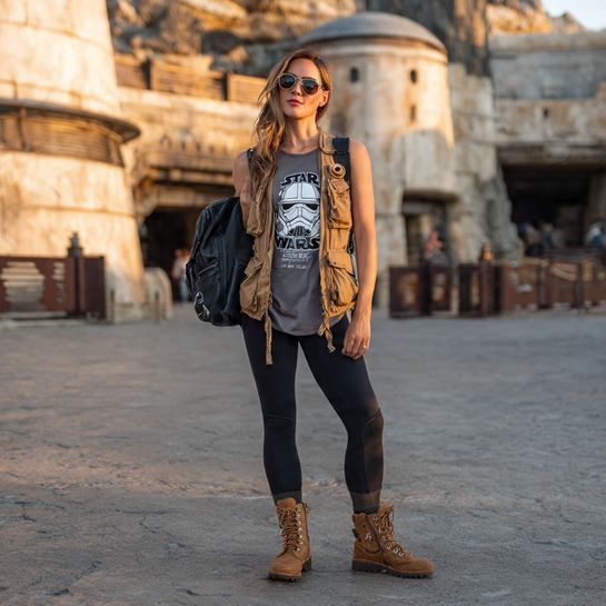 Black leggings with a graphic tank and utility vest create a subtle Rey-inspired look perfect for exploring Batuu.