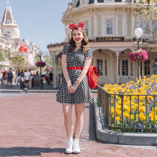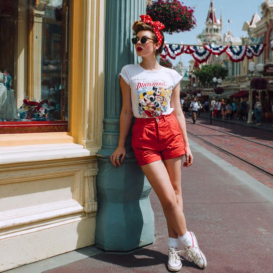 Channel the original icon with a red and white color palette. A white graphic tee with high-waisted black shorts creates a timeless Disney look that photographs beautifully.