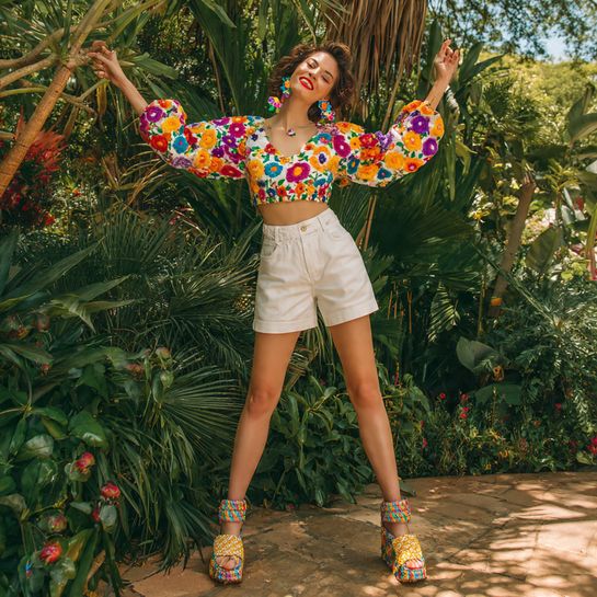 Bold colorful patterns and embroidered details create a Madrigal-family-inspired look that celebrates Colombian culture and Disney magic.