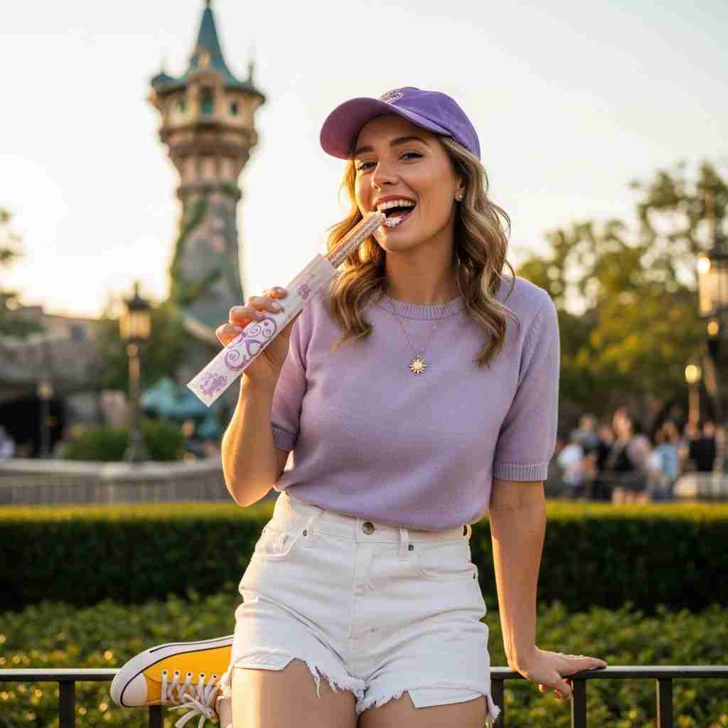 Channel Rapunzel with purple tones and sun motifs. A lavender top with yellow accessories captures her color story while staying park-appropriate.