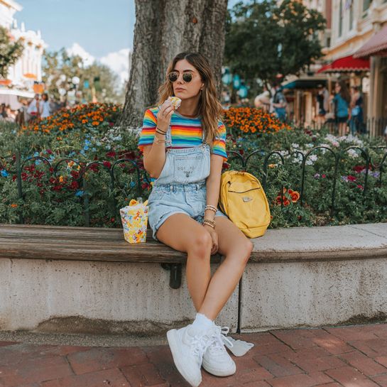 A comfortable denim overall dress or shorts with a colorful tee underneath is effortlessly cute and provides pockets for all your park essentials.