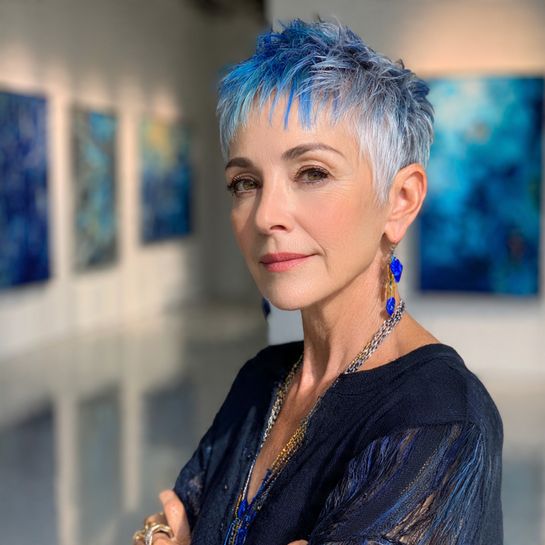 A classic short pixie embracing natural silver with vibrant blue tips creates modern edge.