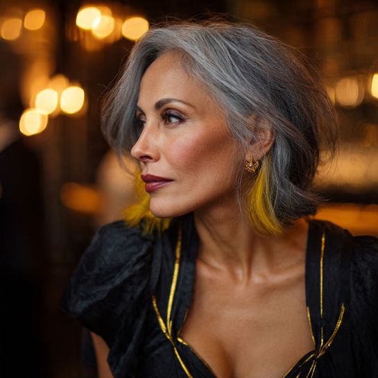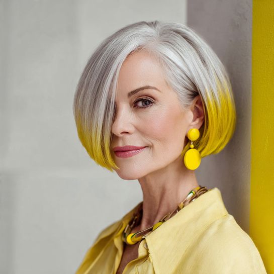 Maintaining length with sunny yellow highlights celebrates both natural silver and playful color.