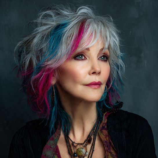 A modern shag with electric blue face-framing streaks adds rock-and-roll edge.