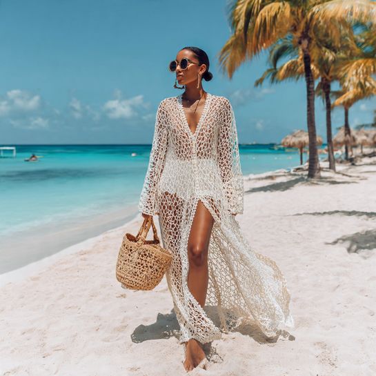Crochet details add artisanal texture to vacation wardrobes. Worn as a dress over a swimsuit, this takes you from beach to beachside café without missing a beat.