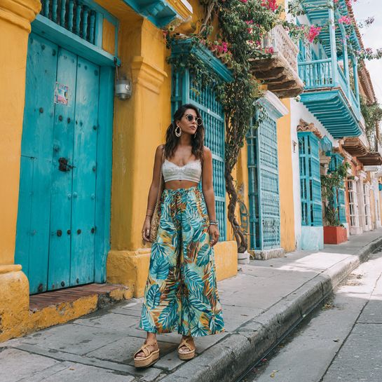 Palazzo pants offer comfort and drama. In a vibrant print with a simple crop top, this creates Instagram-worthy vacation looks that photograph beautifully.