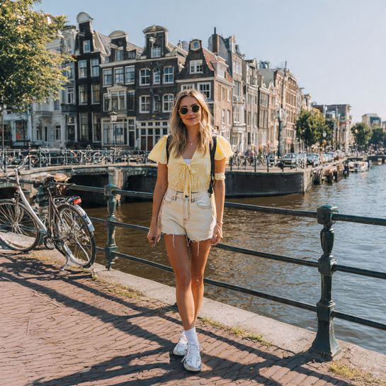 Classic denim shorts ground flowy tops beautifully. A romantic blouse in soft pastels creates the perfect balance of casual and feminine for versatile vacation wear.