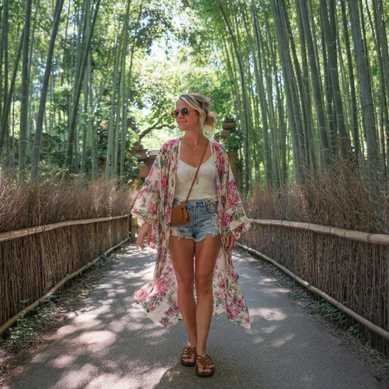 Kimonos add instant style to simple basics. A printed kimono over tank and shorts creates dimension and coverage for air-conditioned restaurants or evening breezes.