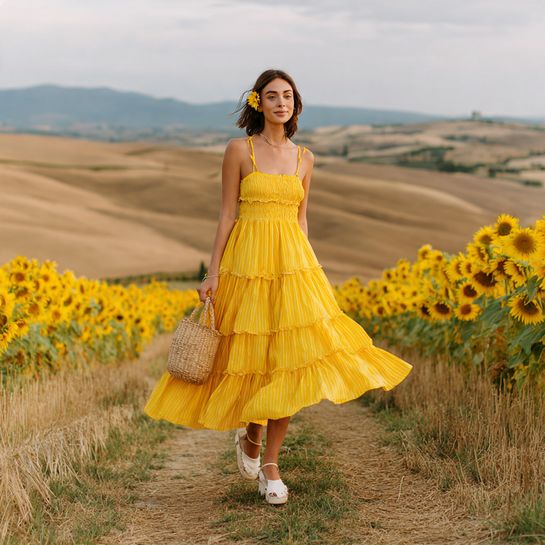 Bold colors celebrate vacation joy. A tiered sundress in sunny yellow creates happy photos while the tiered construction adds movement and flattering shape.