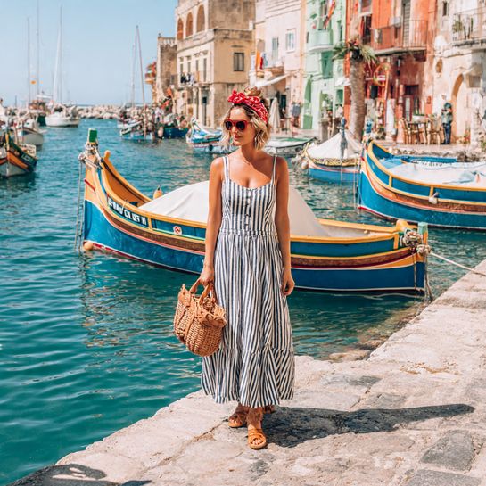 Nautical stripes bring timeless vacation appeal. A flowing maxi dress in navy and white stripes paired with classic espadrille wedges creates effortless elegance for seaside destinations.