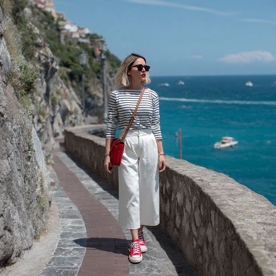 This classic combination never fails on vacation. Cropped white pants show off great shoes while the striped top adds visual interest without overwhelming in photos.