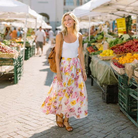 Floral prints embody vacation joy. A flowing midi skirt with a fitted tank creates balanced proportions perfect for wandering through outdoor markets or botanical gardens.