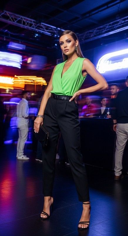 A neon green accent top with neutral trousers creates eye-catching appeal for club nights and parties. The bright pop of color energizes your entire look while keeping it wearable. Pair with black heels and minimal jewelry to let the neon shine. Add a sleek clutch and bold makeup for complete nighttime glamour. Keep hair sleek to maintain focus on the vibrant top. This look guarantees you’ll stand out in any crowd.