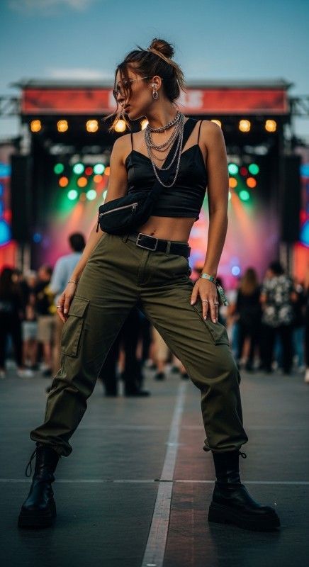 Olive cargo pants with a satin crop top create utilitarian chic for concerts and casual nights out. The edgy combination balances tough and feminine elements beautifully. Pair with chunky boots and layered chains for street-style edge. Add a belt bag and messy bun for hands-free convenience. This look proves comfort and style aren’t mutually exclusive. Own the night with confident attitude.