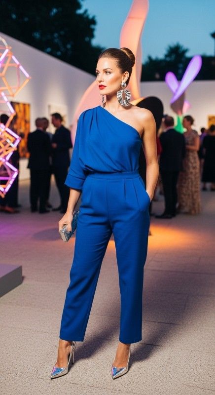 A cobalt blue one-shoulder jumpsuit creates architectural elegance for gallery openings and sophisticated events. The asymmetric neckline draws attention while the tailored fit flatters beautifully. Style with metallic heels and statement earrings for complete glamour. Add a sleek updo and bold lips for red-carpet ready appeal. This modern piece makes you feel like royalty. Command the room with effortless confidence.