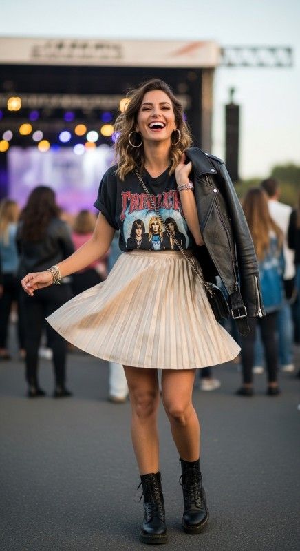 A champagne pleated mini skirt with a graphic tee creates playful contrast for casual nights and concerts. The movement of the pleats adds femininity while the tee keeps it grounded. Pair with combat boots and a leather jacket for rock-chic vibes. Add hoop earrings and a crossbody bag for practical style. This combination proves pretty and tough coexist beautifully. Dance the night away in comfort.