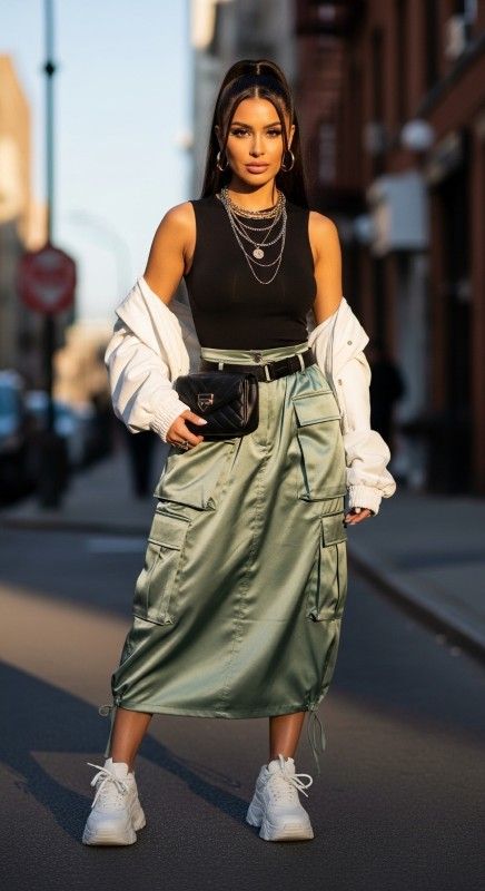 A sage green satin cargo skirt with a fitted tank creates utility-meets-luxury for trendy nights out. The unexpected fabric combination feels fresh and fashion-forward. Style with chunky sneakers and a crop jacket for street-style edge. Add layered necklaces and a belt bag for complete urban styling. Keep hair in a high ponytail for sporty sophistication. This look defines modern cool.