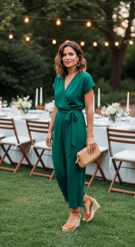 An emerald green wrap front jumpsuit creates flattering versatility for various summer occasions and events. The adjustable wrap ensures perfect fit while the wide legs provide comfortable movement. Style with wedge sandals and gold hoops for polished ease. Add a woven clutch and loose waves for relaxed refinement. This piece transitions from garden parties to dinners seamlessly. Effortless elegance defined.