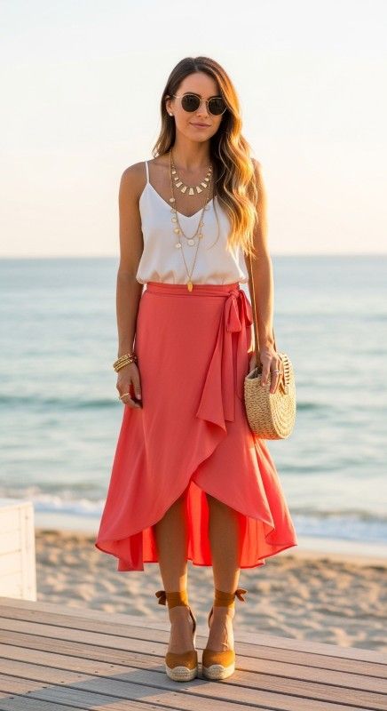A coral asymmetric wrap skirt with a simple cami creates dynamic movement for beach clubs and sunset parties. The unusual hemline adds interest while the flowing fabric ensures comfort. Style with espadrille wedges and layered necklaces for coastal glamour. Add a straw bag and beachy waves for complete vacation vibes. This look captures carefree summer energy perfectly. Live your best life.