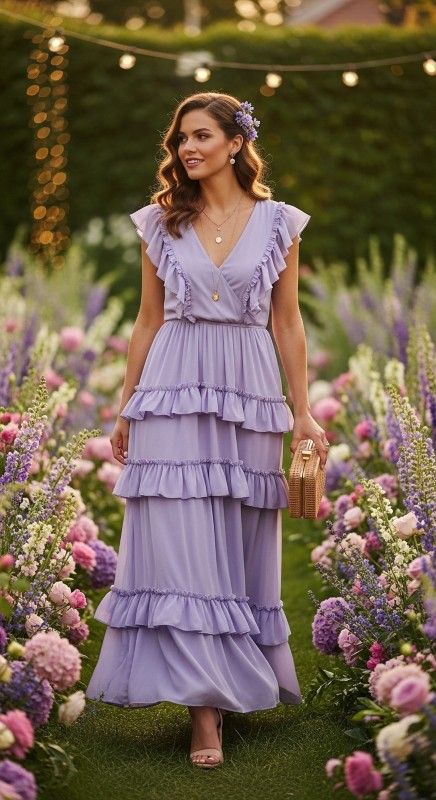A lavender tiered ruffle dress creates romantic whimsy for garden parties and outdoor celebrations. The cascading layers add movement and femininity with every step. Style with block heels and delicate jewelry for balanced proportions. Add a woven clutch and soft curls for complete romantic styling. This dress makes you feel like a summer dream. Float through your evening gracefully.