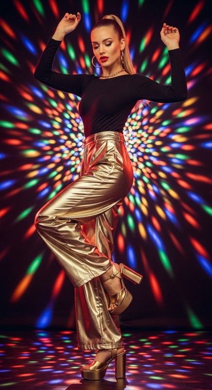 A gold metallic wide-leg pant with a black bodysuit creates disco glamour for dance floors and parties. The reflective fabric catches light with every movement making you shine. Style with platform sandals and minimal jewelry to let the pants star. Add a sleek ponytail and bold lips for complete disco vibes. This look brings the party wherever you go. Dance like nobody’s watching.