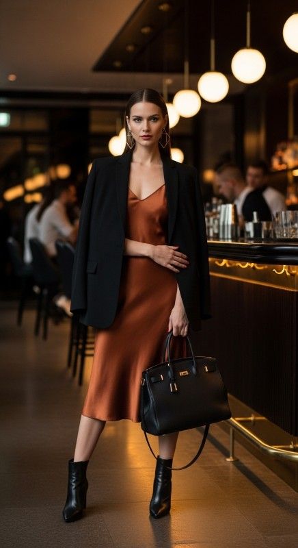 A rust-colored satin slip dress under a tailored black blazer offers sophisticated versatility for modern summer evenings. The luxurious fabric drapes elegantly while the structured blazer adds professional polish for earlier hours. Wear with loafers for daytime meetings then change to ankle boots for nighttime drinks. A structured tote transitions easily from work to play settings. Keep jewelry minimal with geometric earrings for contemporary edge. This power combination commands attention in any setting.