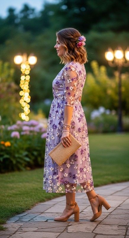 A floral mesh overlay dress in lavender creates romantic dimension perfect for garden parties and sunset dinners. The sheer layer adds intrigue while the solid underlay ensures appropriate coverage. Style with block heels for stability on grass and uneven surfaces. Add a woven clutch and fresh flowers in hair for whimsical charm. Layer delicate bracelets for subtle sparkle that catches the light. This dreamy look captures summer’s magical essence beautifully.