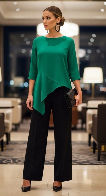 An asymmetric hem top in emerald green paired with wide-leg trousers creates modern elegance for upscale evenings. The unusual hemline adds visual interest while the flowing pants ensure comfort and movement. Style with pointed-toe heels to elongate your silhouette beautifully. Add geometric earrings and a structured clutch for polished completion. Keep hair in a low bun to showcase the neckline details. This contemporary look stands out in the best way.