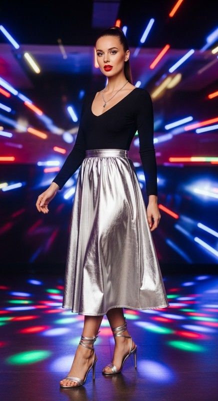 A silver metallic midi skirt with a simple black bodysuit creates disco-inspired glamour for summer nights. The reflective fabric catches every light making you shine throughout the evening. Pair with strappy sandals and minimal jewelry to let the skirt star. Add a sleek ponytail and bold red lips for classic glamour. This combination brings party energy to any occasion. Dance the night away in head-turning style.